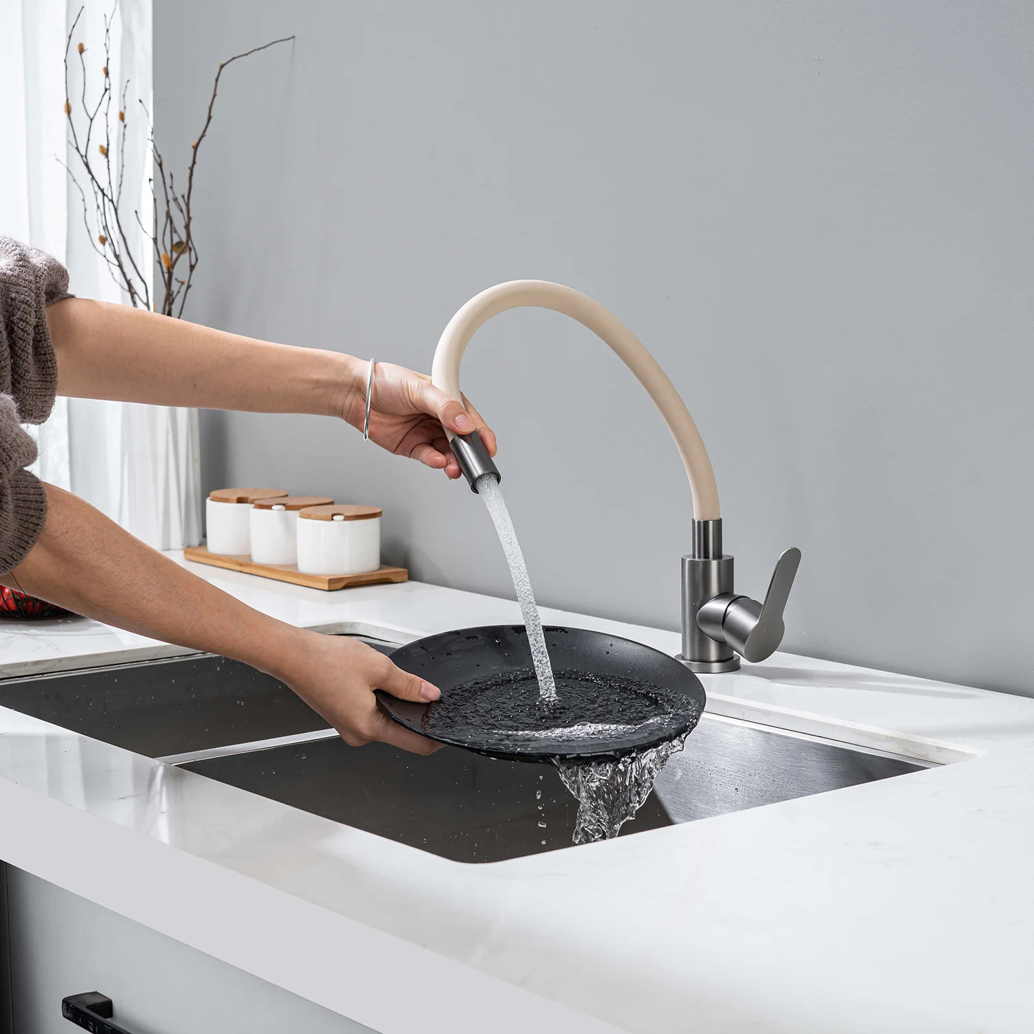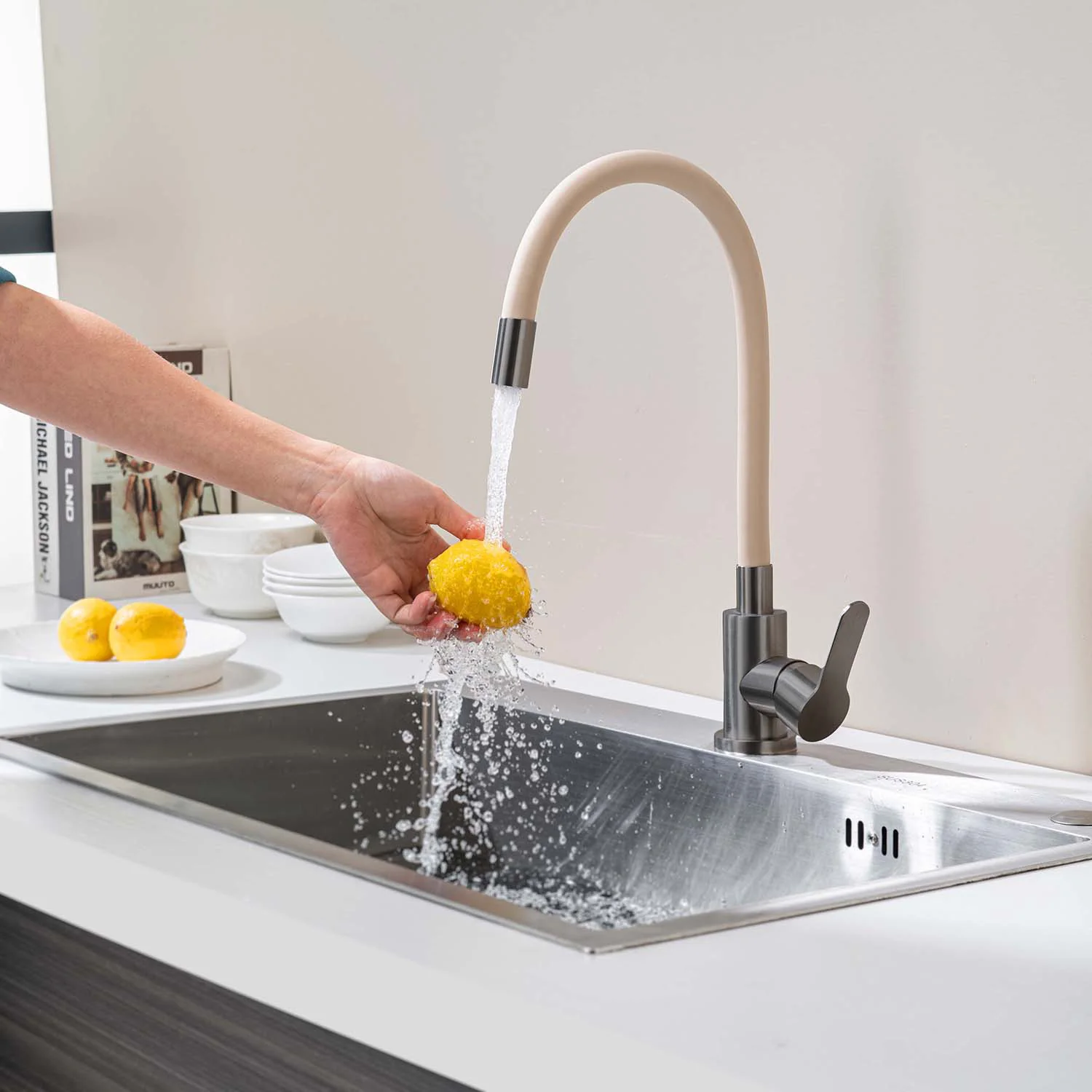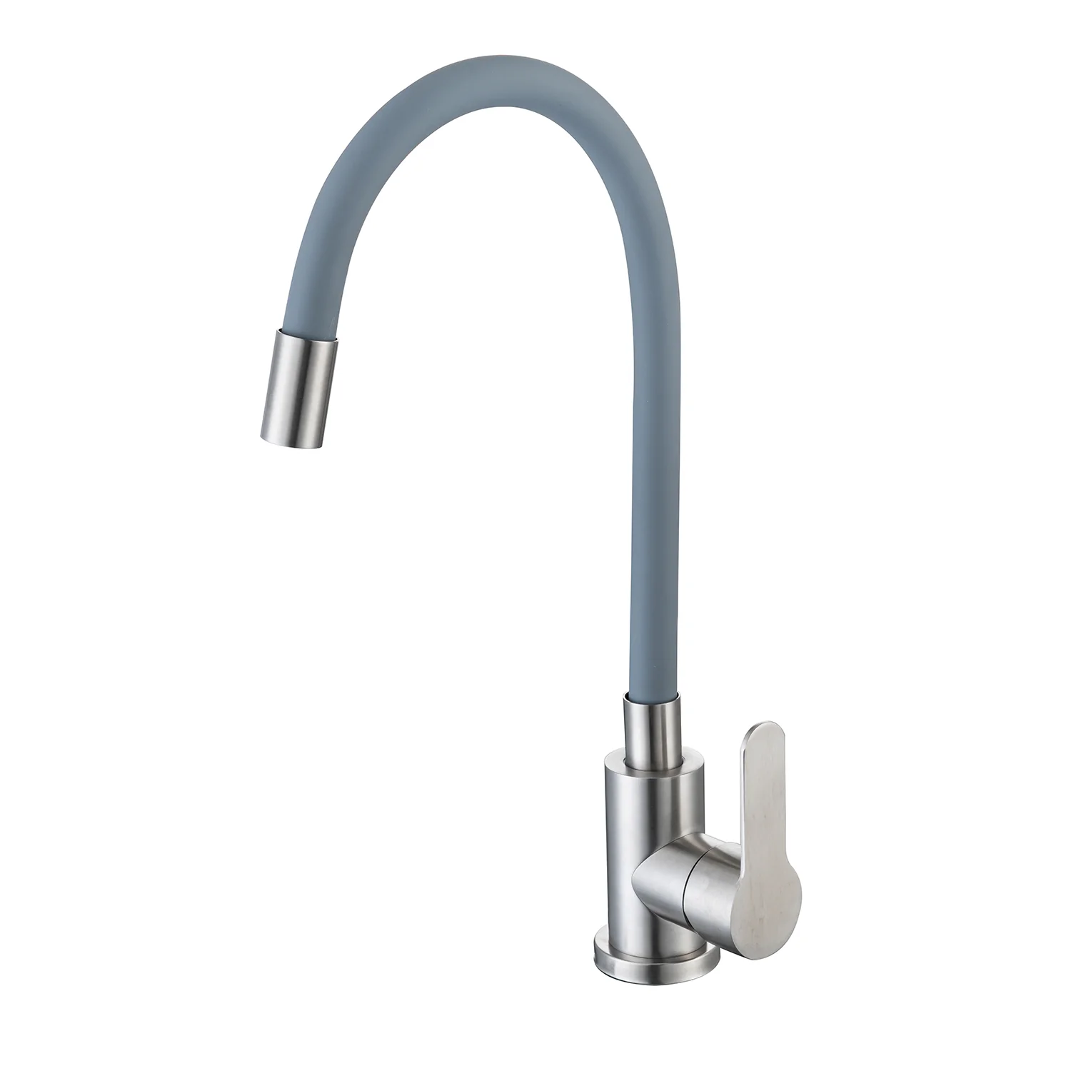 Nowoczesna bateria kuchenna typu gęsia szyja wykonana z wysokiej jakości stali nierdzewnej AISI 304 z elastycznym wężem silikonowym. Elastyczna wylewka umożliwia swobodny obrót o 360°, zapewniając maksymalną funkcjonalność podczas codziennych prac kuchennych – od płukania naczyń po napełnianie garnków. Eleganckie wykończenie w kolorze + Srebro sprawia, że bateria idealnie komponuje się z nowoczesnymi aranżacjami kuchennymi.