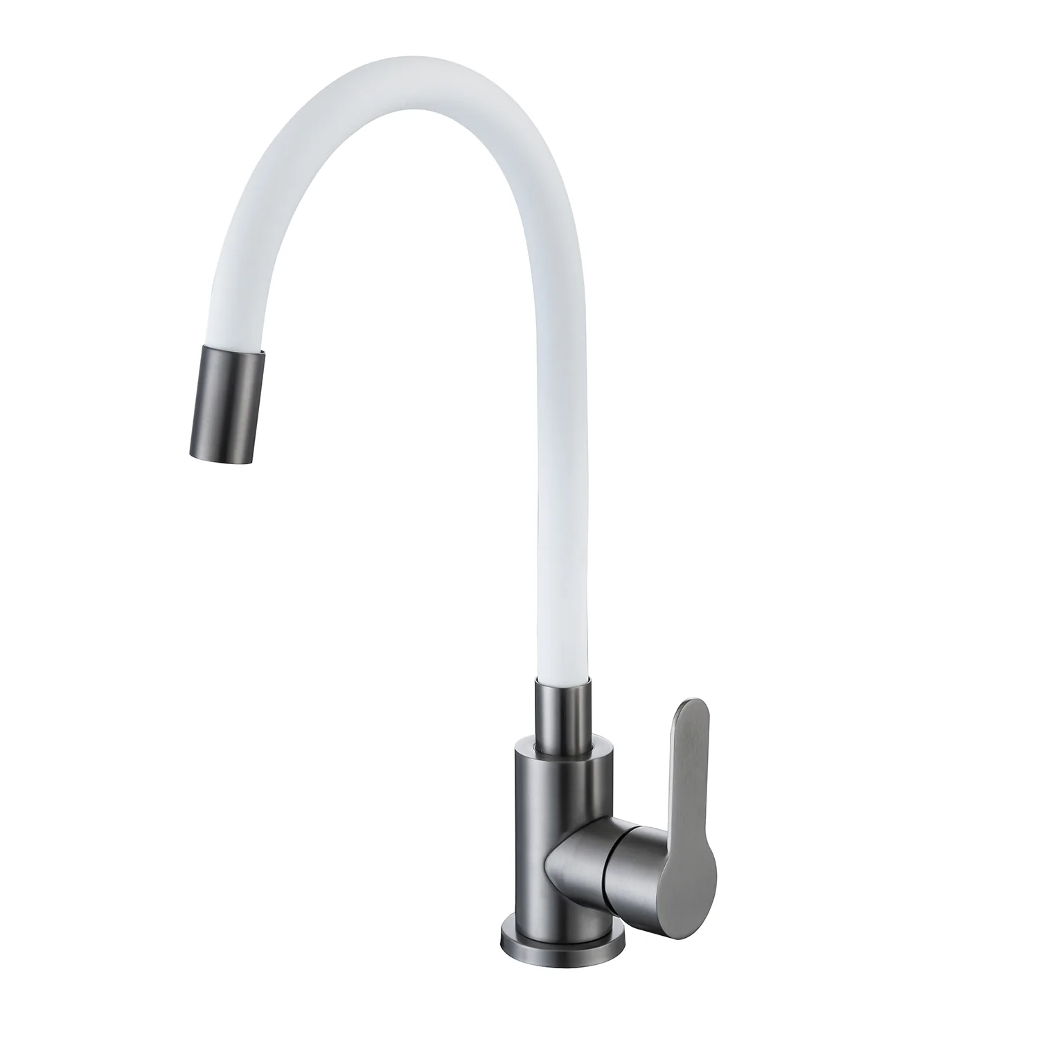 Nowoczesna bateria kuchenna typu gęsia szyja wykonana z wysokiej jakości stali nierdzewnej AISI 304 z elastycznym wężem silikonowym. Elastyczna wylewka umożliwia swobodny obrót o 360°, zapewniając maksymalną funkcjonalność podczas codziennych prac kuchennych – od płukania naczyń po napełnianie garnków. Eleganckie wykończenie w kolorze + Srebro sprawia, że bateria idealnie komponuje się z nowoczesnymi aranżacjami kuchennymi.