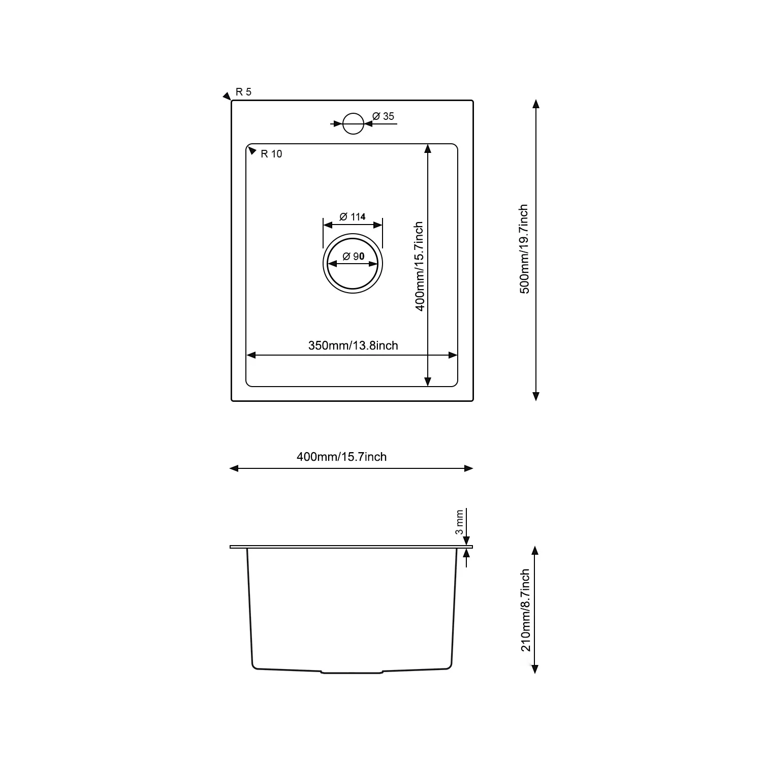 Wymiary zlewozmywaka: 400 × 500 × 210 mm